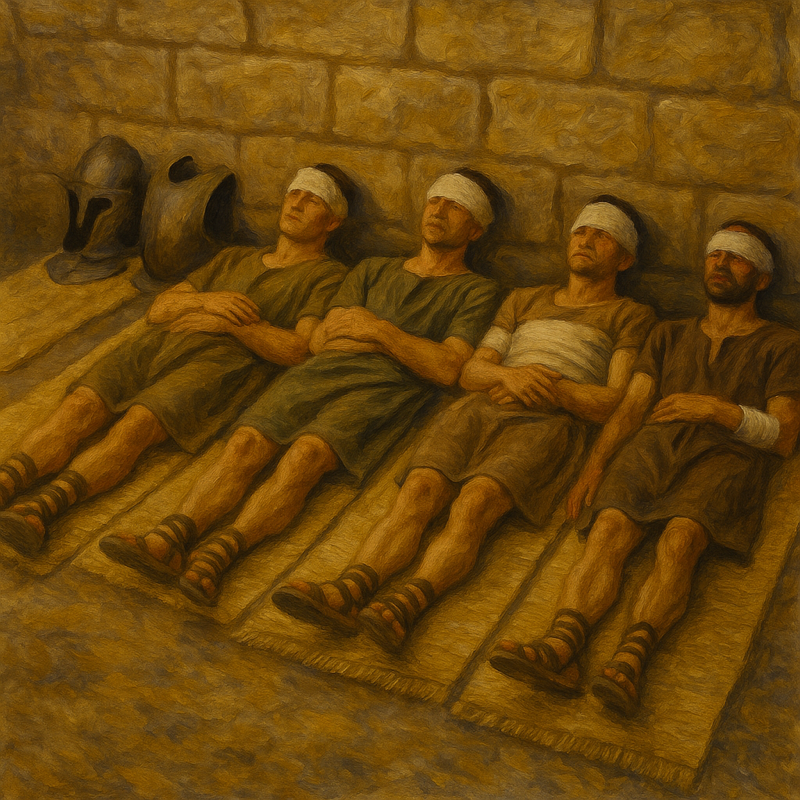 城門に近づき、彼らは医務室――いや、そこから溢れ出ていたもの――を通り過ぎた。扉は開いたままで、その先の通路には草のマットが敷かれ、負傷者たちが整然と横たわっていた。空気はハーブと煙の匂いで重苦しかった。間に合わせの天幕の陰で、包帯を巻かれ青白い顔をした男たちがうとうとしていたが、呼吸は安定していた。彼らの鎧はマット一つ一つにへこみ、血痕を残していた。